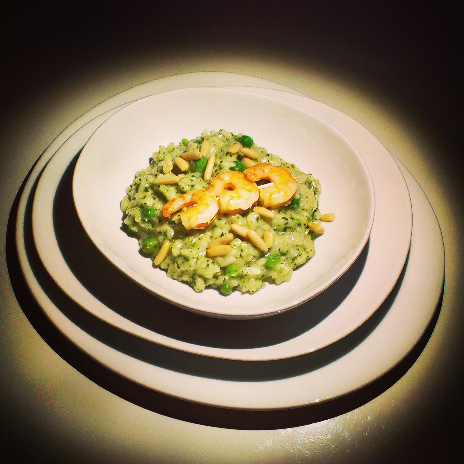 Green risotto with shrimps Posted on Sep 12, 2015 by Pika Pečarič in Food | Part of New Year’s Eve Dinner Menu – creamy risotto with spinach, peas, shrimps and roasted pine nuts.