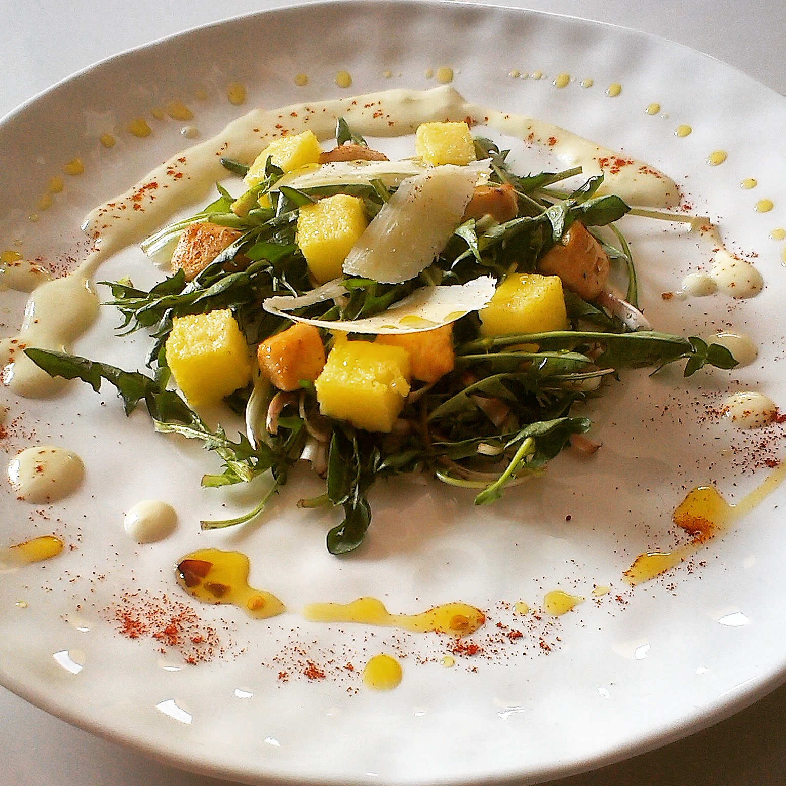 Salad with dandelion shoots Posted on Sep 12, 2015 by Pika Pečarič in Food | Spring is just awesome. And this is awesome dandelion shoots salad with chicken, polenta cubes and Parmigiano-Reggiano cheese dressing.