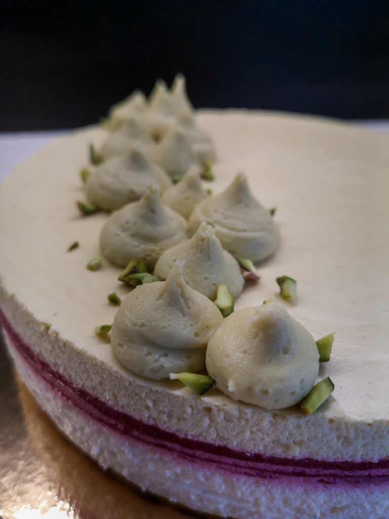 Vanilla white chocolate pistachio mousse cake